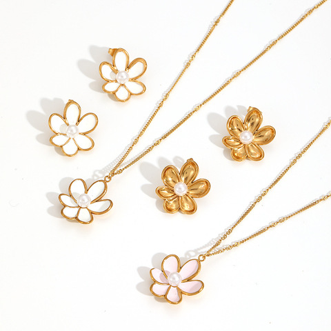 ชุดเครื่องประดับต่างหูต่างหูดอกไม้ทำจากสเตนเลสสตีลของผู้หญิงชุดเครื่องประดับมุกโรแมนติก18K